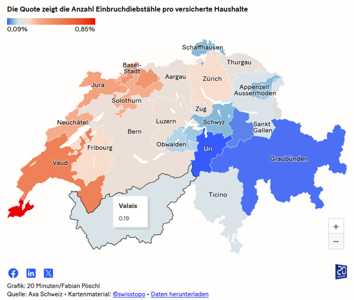 Taux de vol avec effraction par canton en 2024 (pour 1000 foyers assurés)