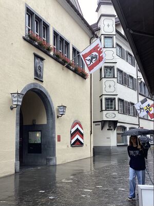Les volets des bâtiments officiels (seulement?) étaient peints aux couleurs du canton.